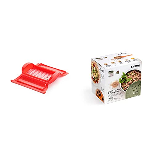 Lékué Microwave Bacon Cooker, Rojo, 28.2x6x24.9 cm & Recipiente para cocinar Quinoa, Arroces y Cereales, 1 Litro, Color Verde